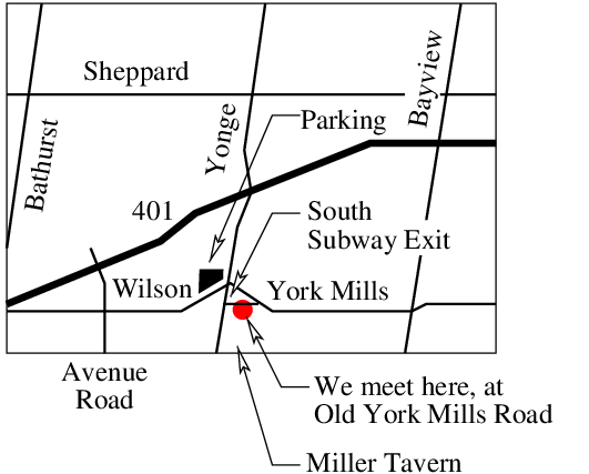 We meet on Old York Mills Road at the south subway exit. If you are on Yonge Street, Old York Mills Road is the first road on the east side, south of York Mills. The two roads are on either side of a gas station. See the map below. The red dot marks the spot!